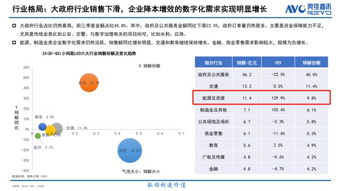 在全球能源格局深度调整、传统能源向清洁能源加速过渡的大背景下,能源行业对于加速数字化转型、精细化管理的需求迫切。2024年,根据AVO Revo《中国大陆小间距LED市场研究报告》统计,能源行业数字化需求活跃,销额同比增长129.9%;头部品牌的主销行业中,能源占比较高,位列前三,[1] 成为未来重点增量行业之一。