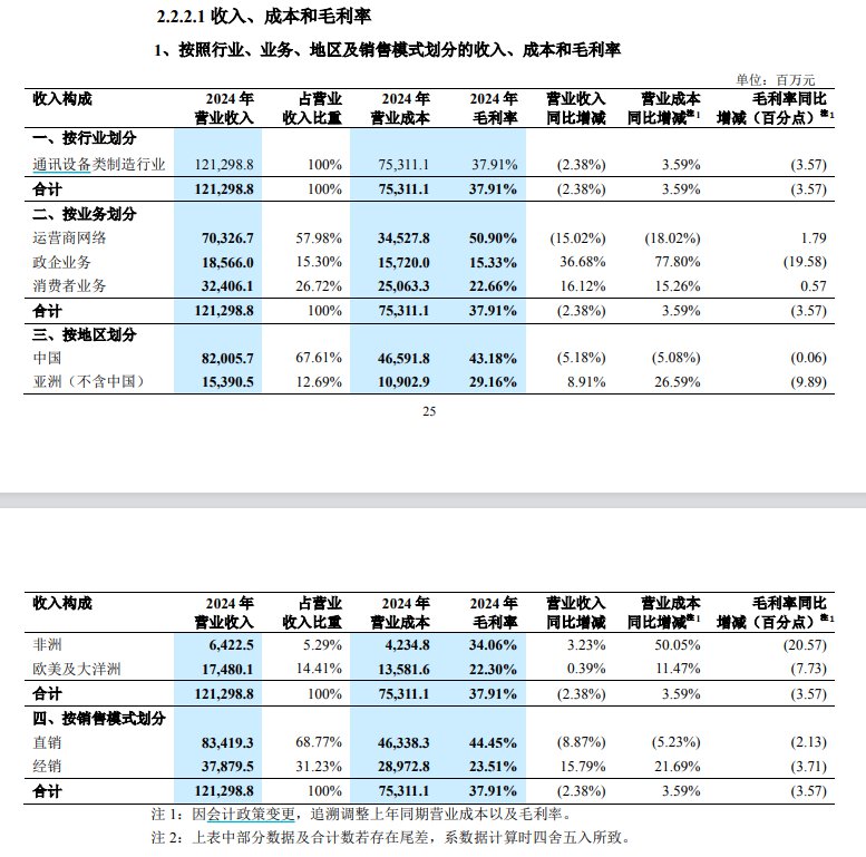 分业务看,中兴通讯运营商网络业务营收703.27亿元,同比降15.02%,毛利率为50.90%,同比增加1.79个百分点。政企业务营收185.66亿元,同比增36.68%,毛利率为15.33%,同比下滑19.58个百分点。消费者业务营收324.06亿元,同比增16.12%,毛利率为22.66%,同比增加0.57个百分点。