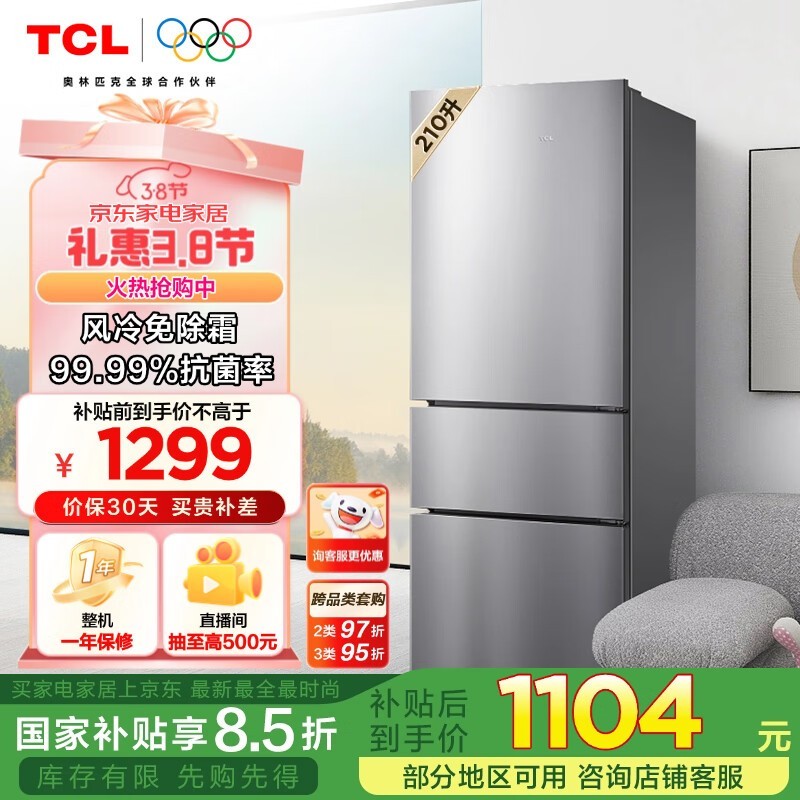 TCL210L三门冰箱风冷无霜小户型宿舍静音节能省电低至899元