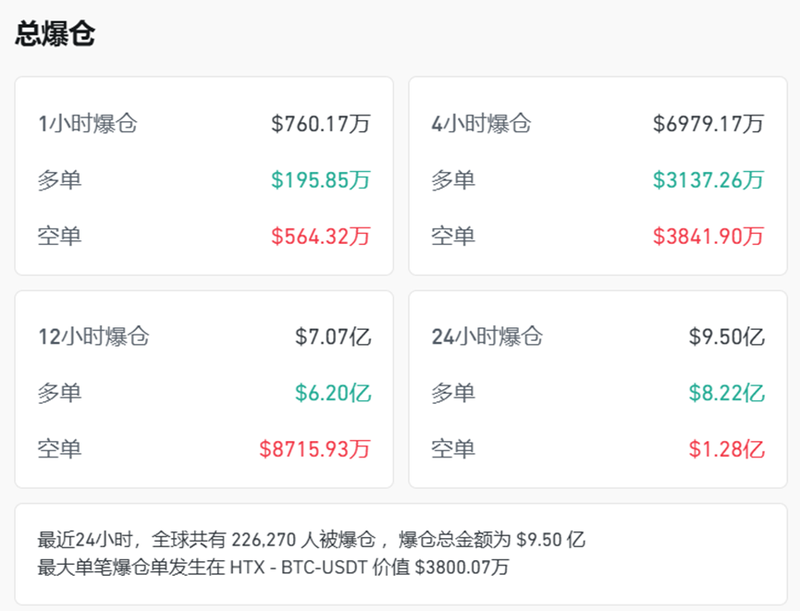 CoinGlass数据显示,截至28日晚8点10分左右,在24小时内,全球约22.63万人被爆仓,爆仓总金额达9.50亿美元,24小时爆仓金额涨幅达22.10%。其中,多单爆仓金额达到8.22亿美元,占总爆仓金额的86.5%。最大单笔爆仓发生在HTX交易所的BTC-USDT交易对,金额高达3800.07万美元。