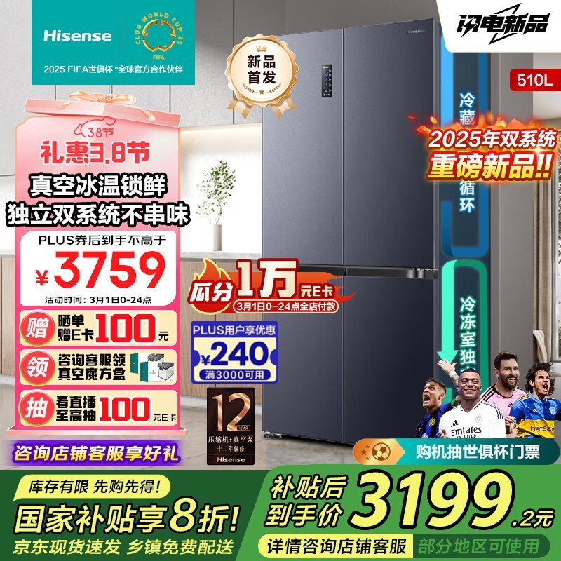 海信510升双系统冰箱促销:大容量保鲜,到手价2645元!