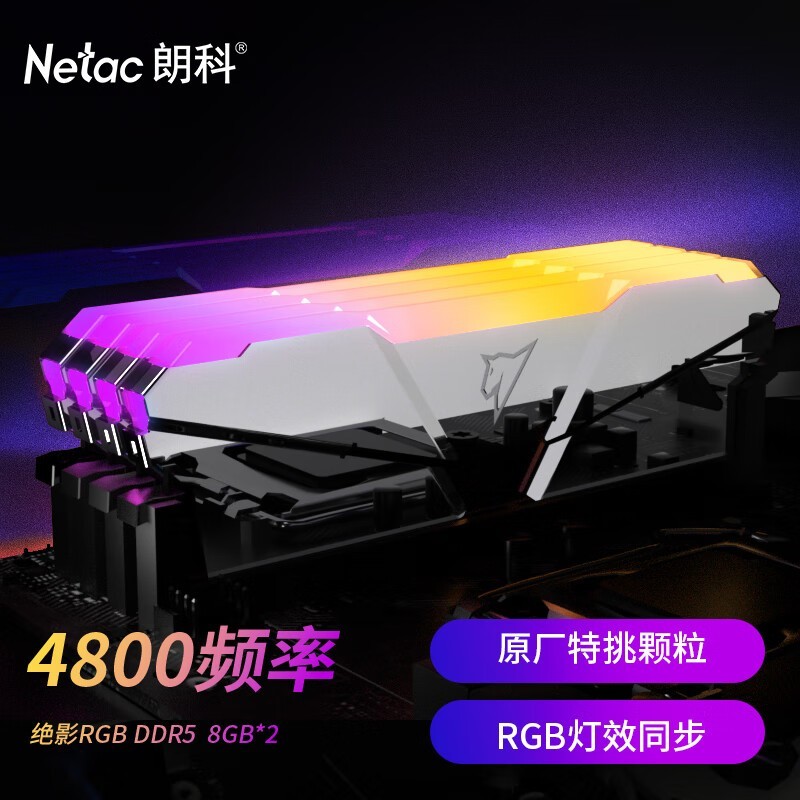朗科16GB(8Gx2)DDR5台式机内存条4800绝影RGB电镀银C40款