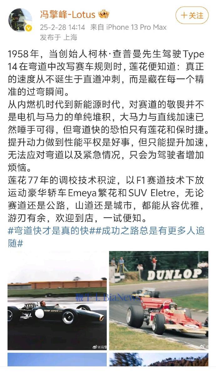 鞭牛士 3月1日消息,莲花集团CEO冯擎峰昨日在微博发文称,对赛道的敬畏并不是电机与马力的单纯堆积,大马力与直线加速已然唾手可得,但弯道快的只有莲花和保时捷。