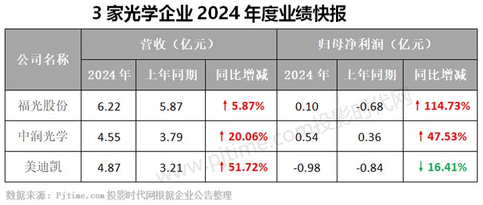 近日,福光股份、中润光学、美迪凯3家光学企业陆续发布2024年业绩快报(未经审计)。