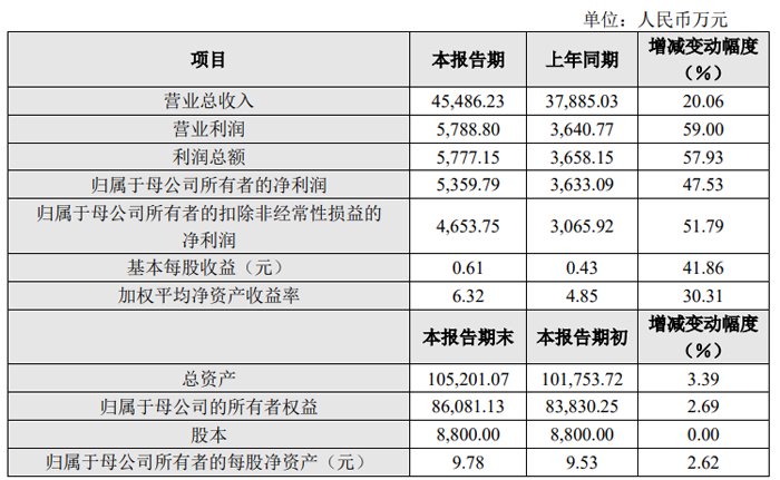 报告期内,嘉兴中润光学科技股份有限公司实现营业总收入45,486.23万元,同比增长20.06%;实现利润总额5,777.15万元,同比增长57.93%;实现归属于母公司所有者的净利润5,359.79万元,同比增长47.53%;实现归属于母公司所有者的扣除非经常性损益的净利润4,653.75万元,同比增长51.79%。