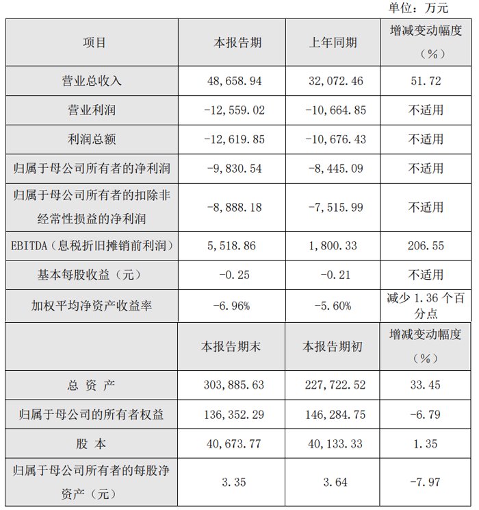 2024 年度,实现归属于母公司所有者的净利润-9,830.54 万元,较上年同期减少 1,385.45 万元;实现归属于母公司所有者的扣除非经常性损益的净利润-8,888.18 万元,较上年同期减少 1,372.19 万元。报告期 EBITDA(息税折旧摊销前利润)5,518.86 万元,同比增加206.55%,主要是报告期营业收入增加。