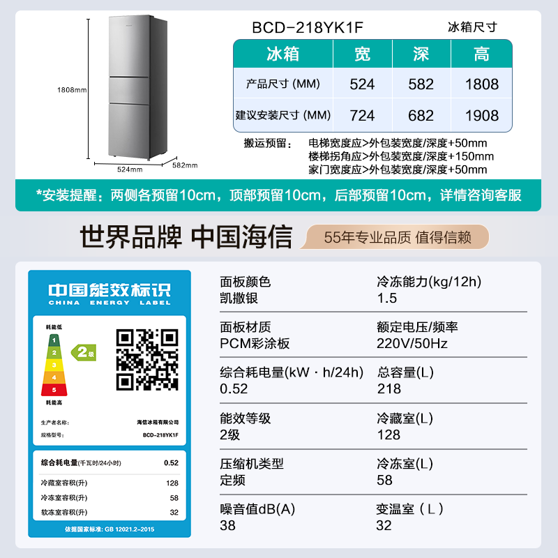海信BCD-218YK1F三门冰箱218升租房小户型二级能效节能静音