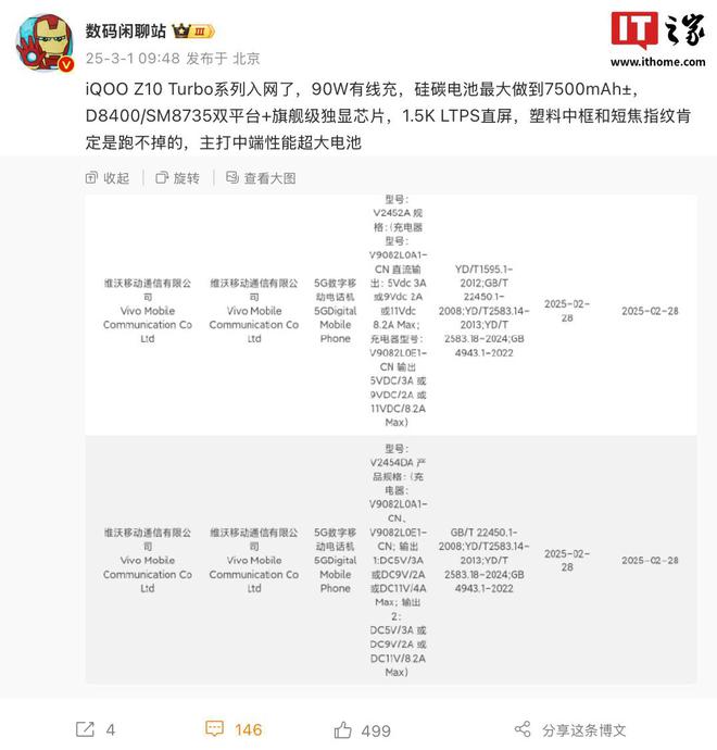 3 月 1 日消息,博主@数码闲聊站 今天透露iQOO Z10 Turbo 系列手机现已正式入网,该机标准版搭载D8400(联发科天玑 8400)处理器,Pro 版本配备 SM8735(骁龙8s至尊版)处理器,同时配备“旗舰级独显芯片”。