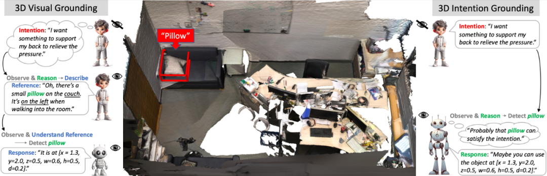 图一:我们引入了 3D 意图定位(右),这一新任务旨在根据人类意图句子(例如:“我想要一个能支撑我的背部、缓解压力的物品”),在 3D 场景中通过 3D 边界框检测目标物体。相比之下,现有的 3D 视觉定位(左)依赖于人类的推理和参考来进行检测。该示意图清晰地区分了观察和推理的执行方式:左侧由人类手动完成,右侧则由 AI 自动完成。