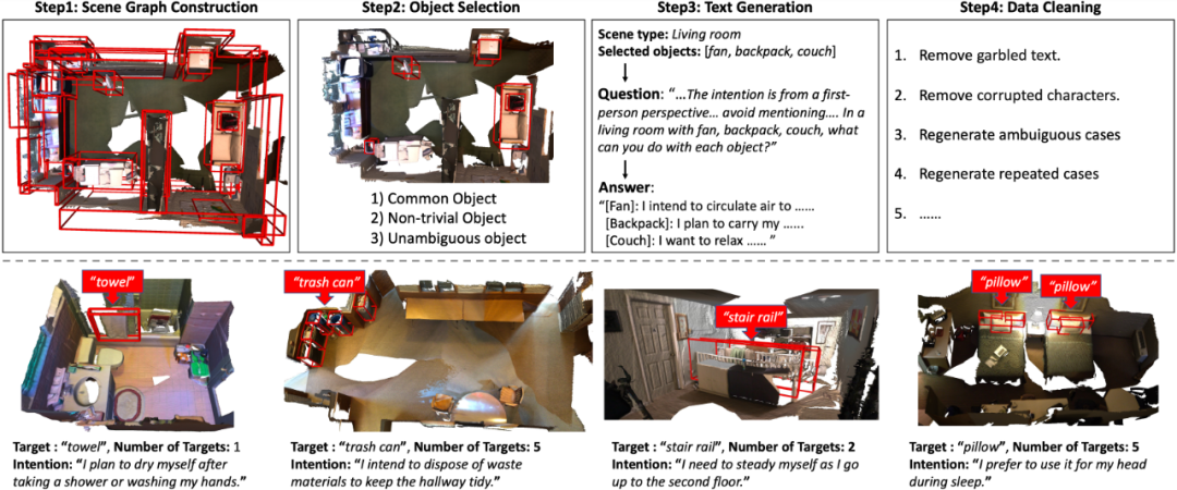 为了推动 3D 意图定位研究,我们构建了 Intent3D 数据集,包含 44,990 条意图文本,涉及 209 类物体,基于 1,042 个 ScanNet 点云场景。由于意图表达的多样性,使用预定义格式进行标注会限制模型的泛化能力。此外,众包标注往往缺乏可靠性,而专业标注成本高且难以扩展。因此,如图二所示,我们采用 GPT-4 生成意图文本,并经人工质量检查,确保高准确性和多样性。