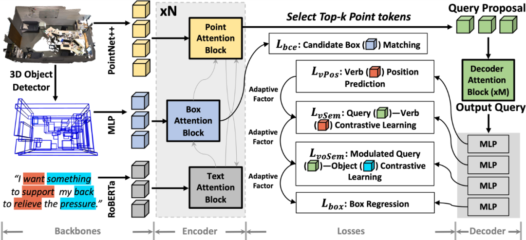 图三:IntentNet:(骨干网络)PointNet++ 用于提取点特征;MLP 编码 3D 目标检测器预测的框;RoBERTa 编码文本输入。(编码器)基于注意力的块用于多模态融合,通过与文本特征的集成来增强框特征。(解码器)具有最高置信度的前 k 个点特征被选择为提出的查询(query),然后通过基于注意力的块进行更新。几个 MLP 用于线性投影查询,以便进行后续的损失计算。(损失函数)该模型学习使用 L_bce 将候选框与目标对象进行匹配;查询(query)被训练以识别动词 (L_vPos),与动词对齐 (L_vSem),并与宾语对齐 (L_voSem)。
