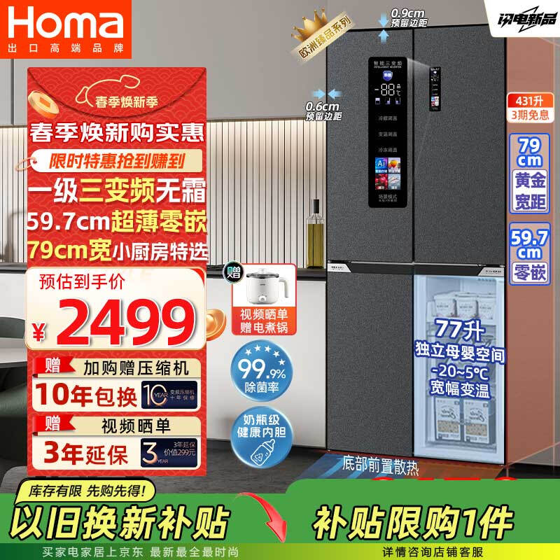 奥马超薄四门冰箱:60cm空间大容量,一级能效净味除菌,静音节能家居新选择