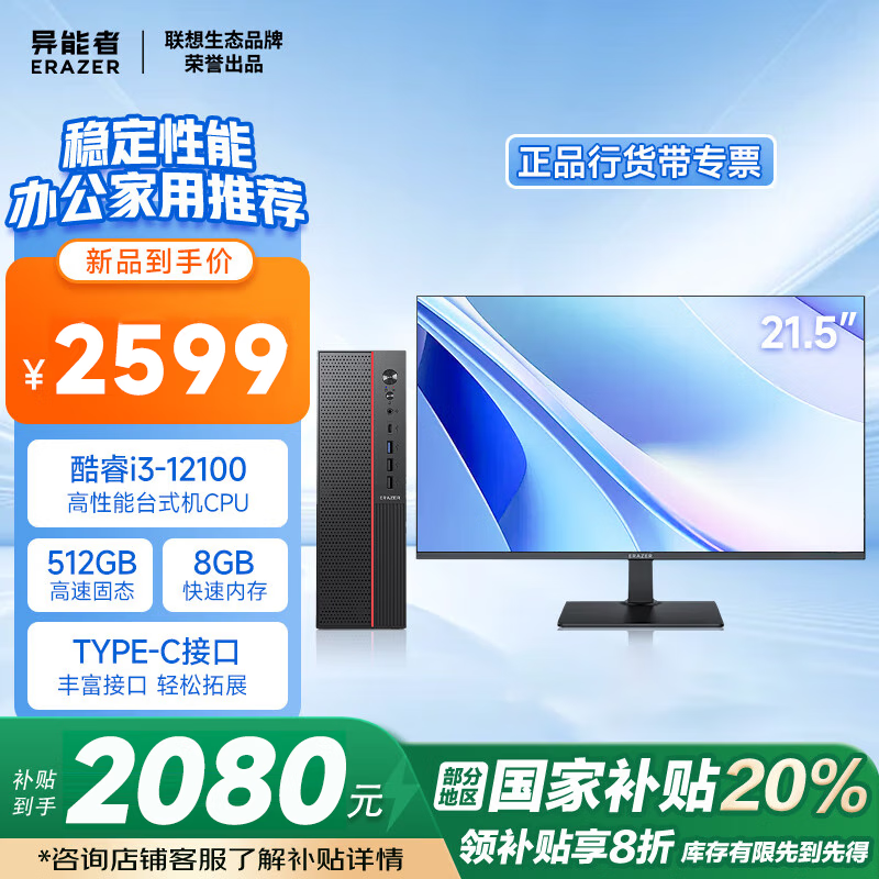 联想异能者ERAZER台式机电脑主机12代i3-12100京东特惠2599