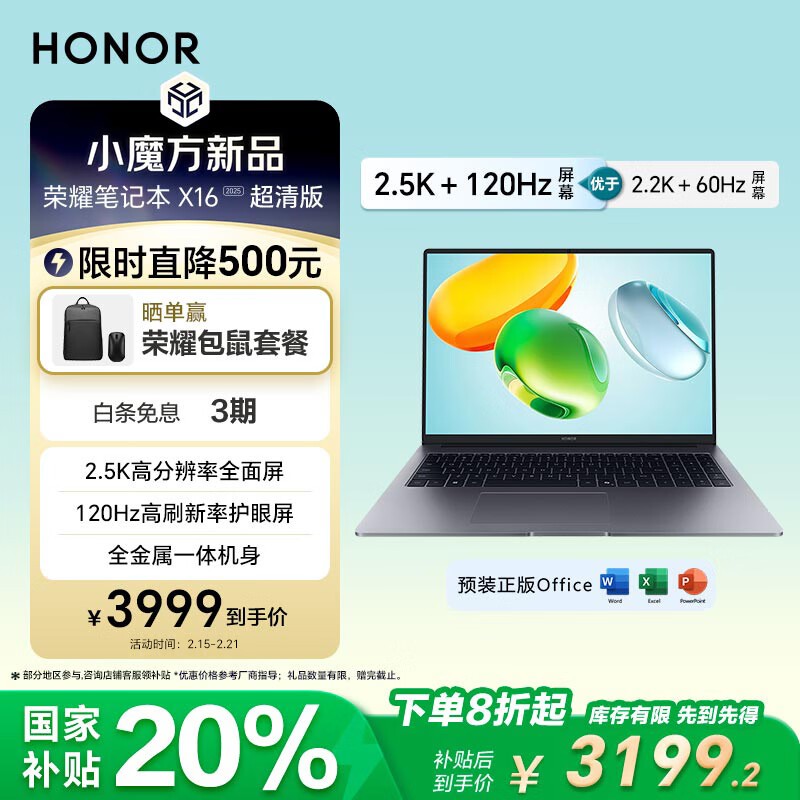 荣耀笔记本X16超清版:轻薄高效,2.5K高分辨率屏幕,政府补贴价3999元起