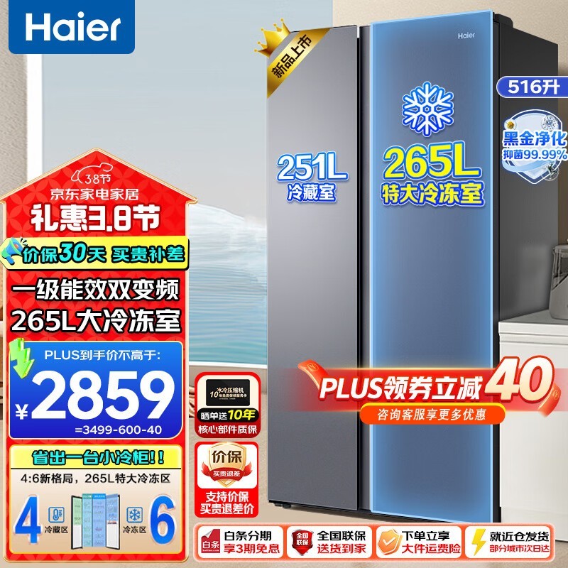 海尔516升巨能冻冰箱:黑金净味,变频双循环,大空间低噪音,4699元高性价比之选
