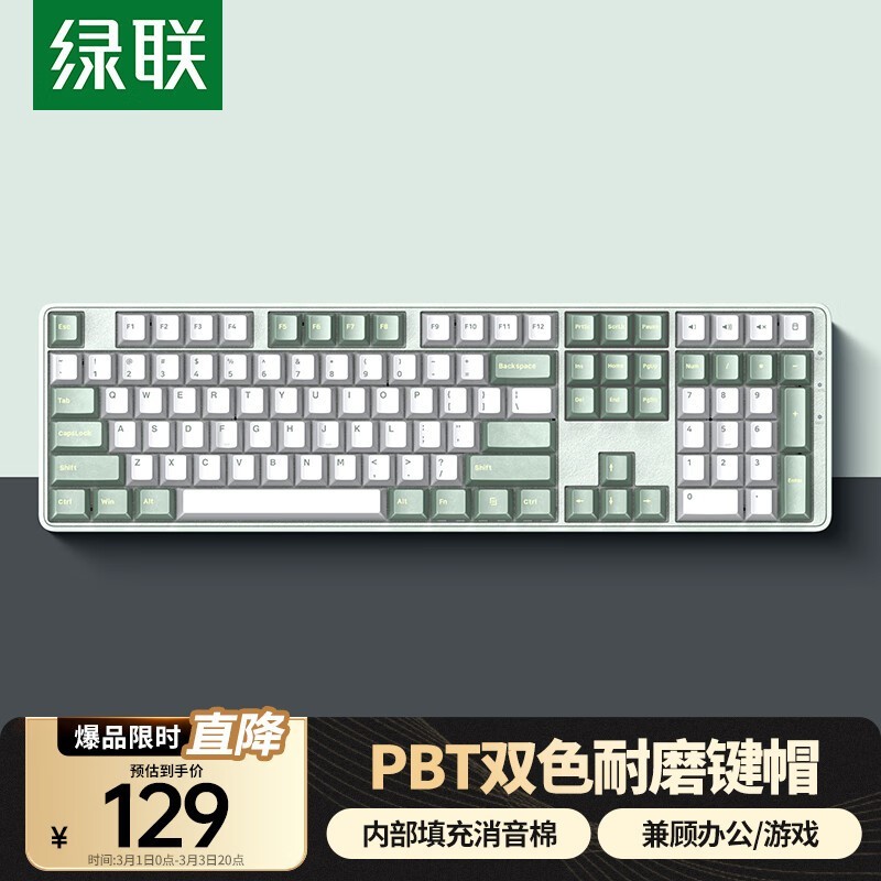 绿联KU103机械键盘京东降至129元全键无冲红轴芦苇色