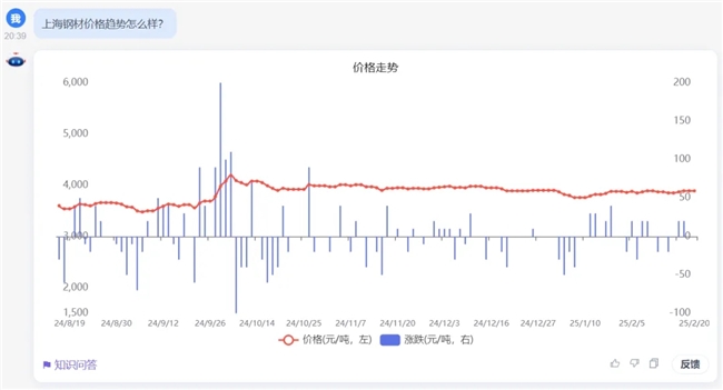 当工业大数据遇上DeepSeek超强算力,找钢AI实现数据处理能力三级跳!嵌入胖猫云后,找钢AI将凭借智能化交互体验的全面升级,为钢贸企业打造全场景智能中枢。通过AI驱动,不仅能帮助客户进行价格趋势分析,还能助力客户快速获取与之相关的仓储、物流等数据,通过智能风控实时拦截交易风险,辅助企业从价格博弈转向价值经营,从而实现降本增效与智慧决策。