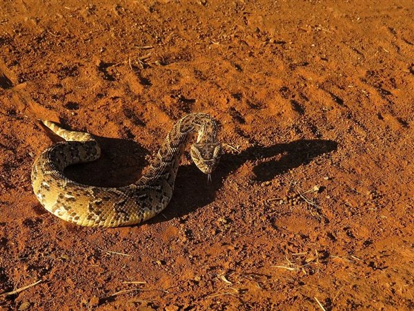 鼓腹巨蝰(Bitis arietans)的体形相对较小,短的只有 15 厘米,长的不超过 1.8 米。这种蛇喜欢在夜间觅食,而且不怕惊吓,就算有人靠近也不赶快躲开。这导致经常有人在黑暗中踩到它光滑又有弹性的身体,随后腿部被狠咬一口。