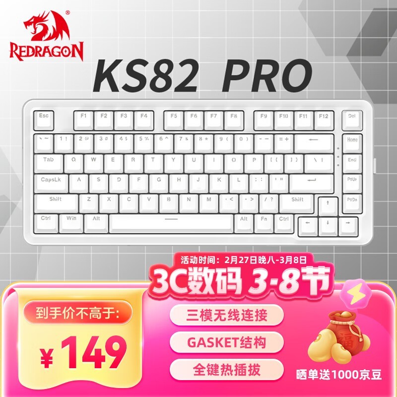 红龙KS82PRO三模机械键盘龙舞轴白色版96.11元包邮(原价149)