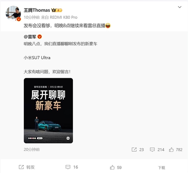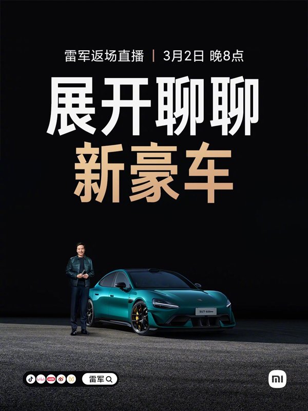 快科技3月1日消息,今天,小米创办人雷军预告,明晚八点,我们直播聊聊刚发布的新豪车小米SU7 Ultra。