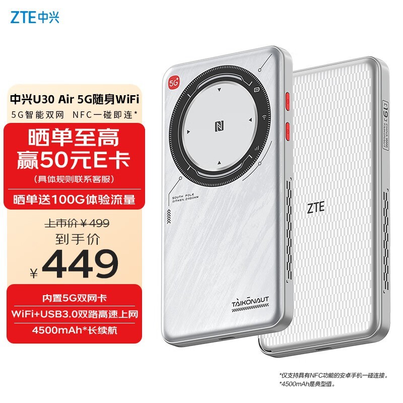 中兴5G随身WiFi U30 Air航天版领券低至449元包邮