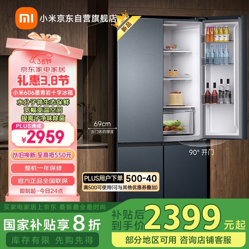 米家606L风冷十字对开门冰箱大容量变频静音节能环保