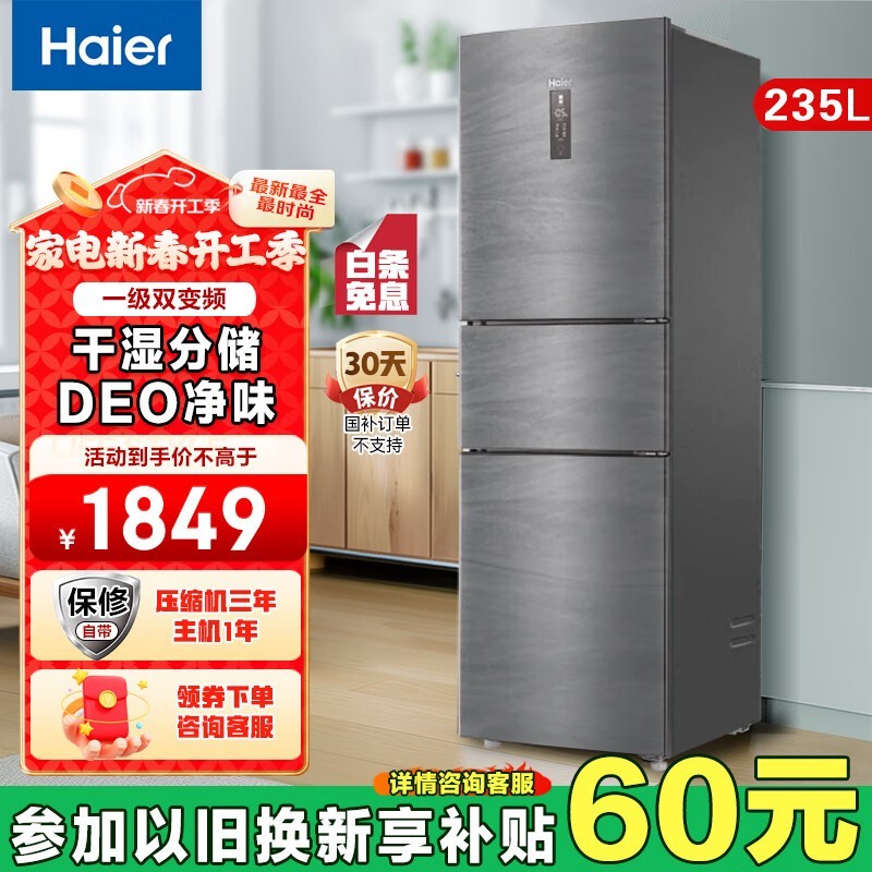 海尔BCD-235WLHC35DDY三门冰箱京东满减仅1749元