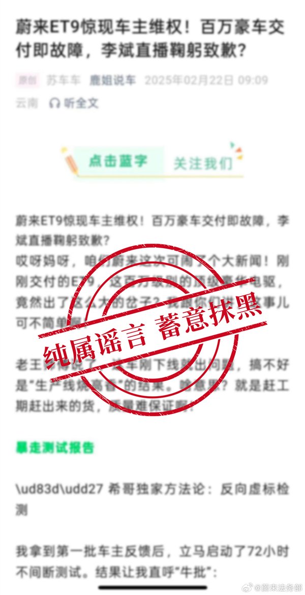 网络账号“鹿姐说车”在智能电动行政旗舰蔚来ET9正式交付前,于2月22日9:09就已经发布了事先准备好的关于ET9交付的谣言及长篇抹黑文案,后立刻删除,对法律的无视和践踏令人发指!