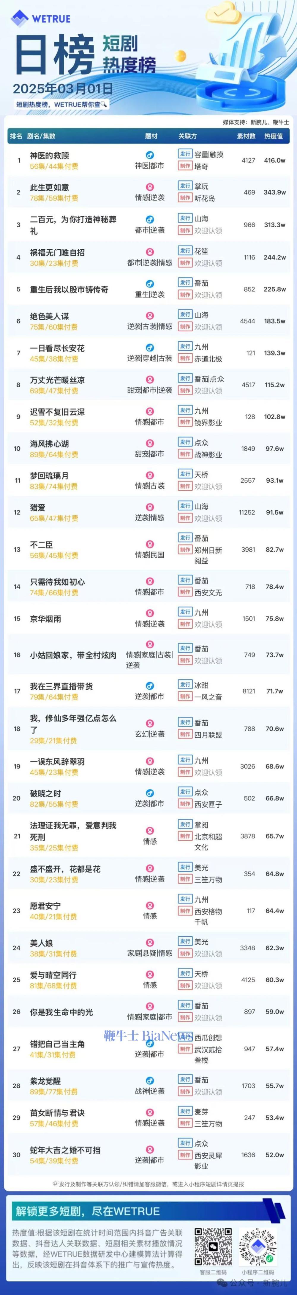 编者按:为帮助短剧从业者提供更多信息,专注于短剧报道的新腕儿和科技媒体鞭牛士联合WETRUE短剧热度榜共同推出短剧热度榜。