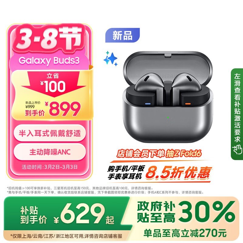 三星Galaxy Buds3真无线蓝牙耳机上海国补优惠仅587元
