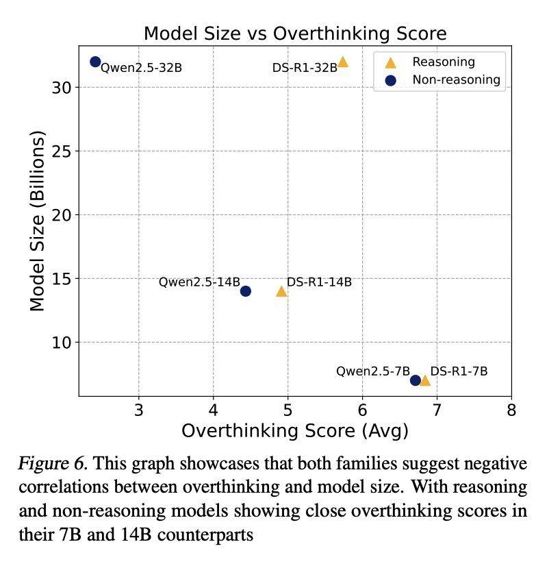 如图 6 所示,分析表明,模型规模与过度思考行为之间存在负相关。研究者假定,较小的模型在环境理解方面有困难,导致它们更依赖于内部推理链,增加了它们过度思考的倾向。