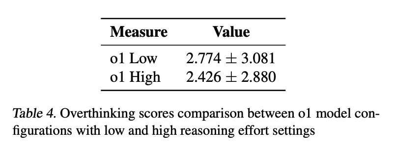 分析表明,低推理努力程度的 o1 模型的过度思考得分比高推理尝试程度的模型高出 35%。如表 4 所示,两种配置的平均过度思考得分差异具有统计学意义,这表明增加 token 分配可能会减少代理上下文中的过度思考。