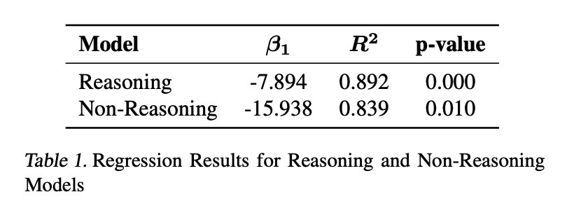 研究者的统计分析结果揭示了过度思考行为的两种不同模式。首先,回归分析表明,无论是推理还是非推理模型,过度思考与问题解决率之间存在显著的负相关性(如图 1), 后者随着过度思考的增加而出现急剧的性能下降。