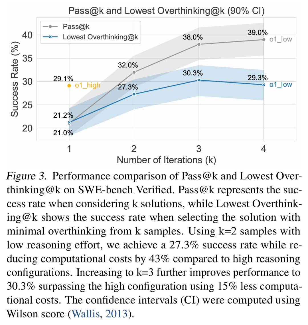 另外,与使用成本高昂的强推理配置相比,生成两个较少推理量的解决方案(总计 800 美元)并选择其中过度思考分数较低的一个,则可以实现 27.3% 的问题解决率。这种简单的策略几乎与强推理配置的表现相当,同时将计算成本降低了 43%。