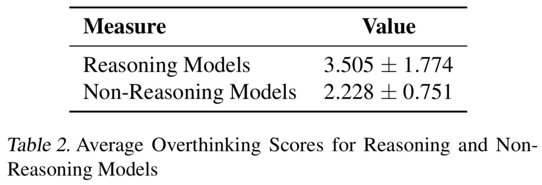 其次,直接比较表明,推理模型始终表现出更高的过度思考分数,几乎是非推理模型的三倍,如表 2 所示。这意味着,推理模型更容易受到过度思考的影响。