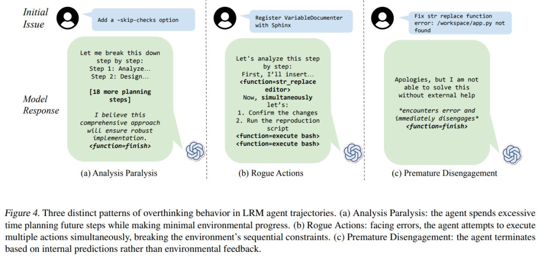 通过分析,本文识别出了 LRM 智能体轨迹中三种不同的过度思考模式: