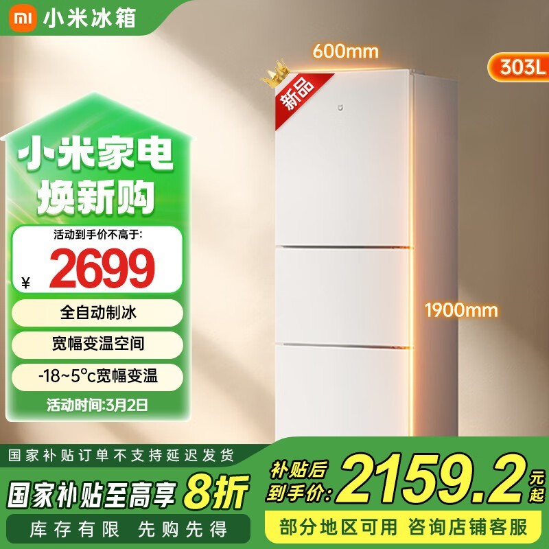 米家多门冰箱303L冰羽白风冷无霜一级能效京东活动价2159元