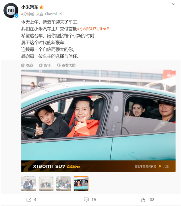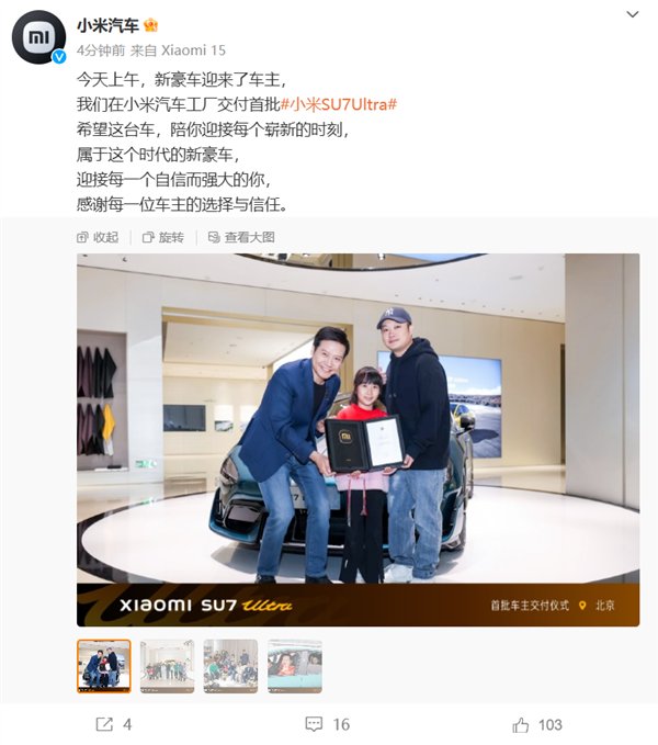 从现场视频来看,相比首批小米SU7交付时雷军亲自为车主开车门,今天他改为与首批SU7 Ultra车主一起揭开车幕,并与车主热情握手、交流,亲手递上新车钥匙,还一起开心合影留念,仪式感拉满。