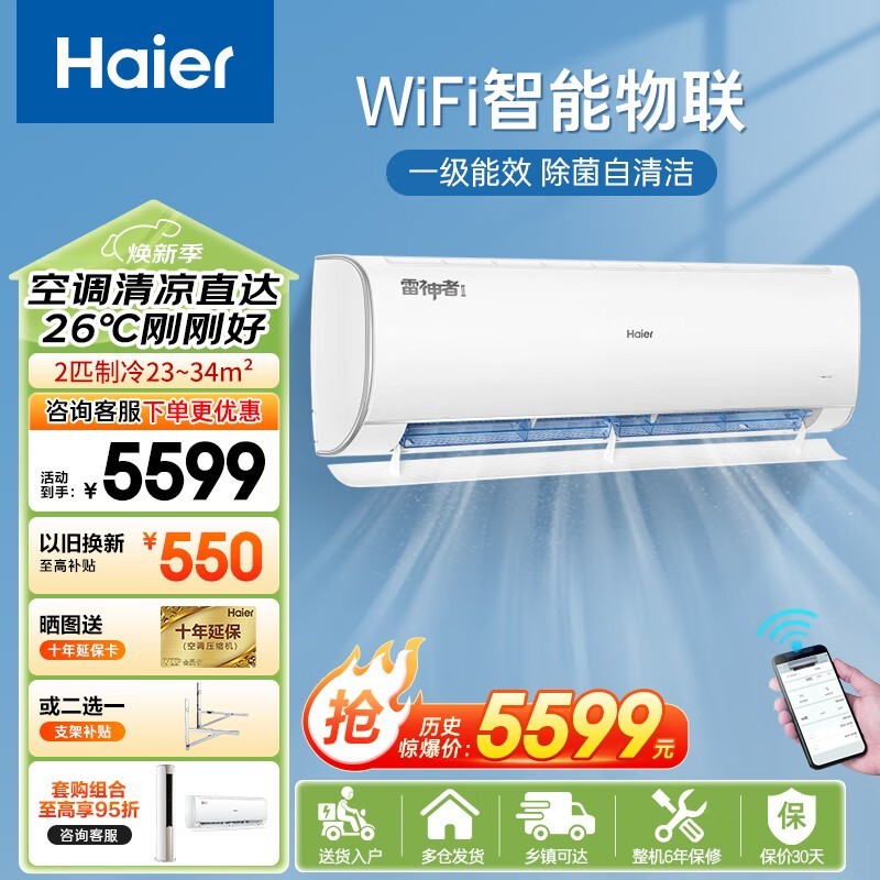 海尔雷神者空调挂机大2匹变频冷暖新一级能效京东4699元促销