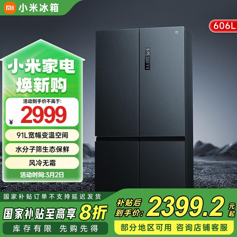 米家606L风冷十字对开门冰箱仅2399元