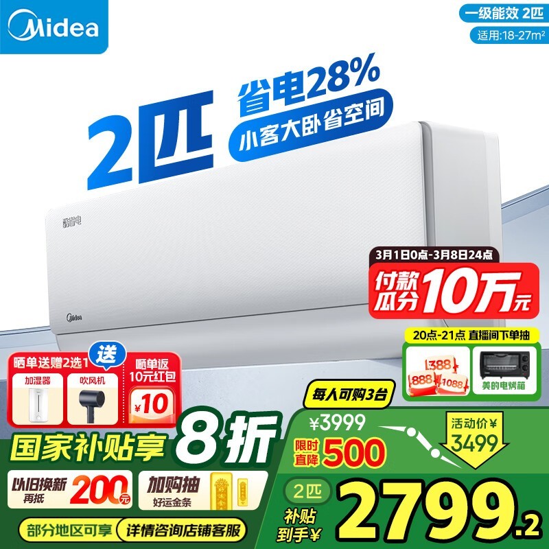 美的2匹壁挂式空调KFR-46GW酷省电系列新一级能效京东3489元包邮