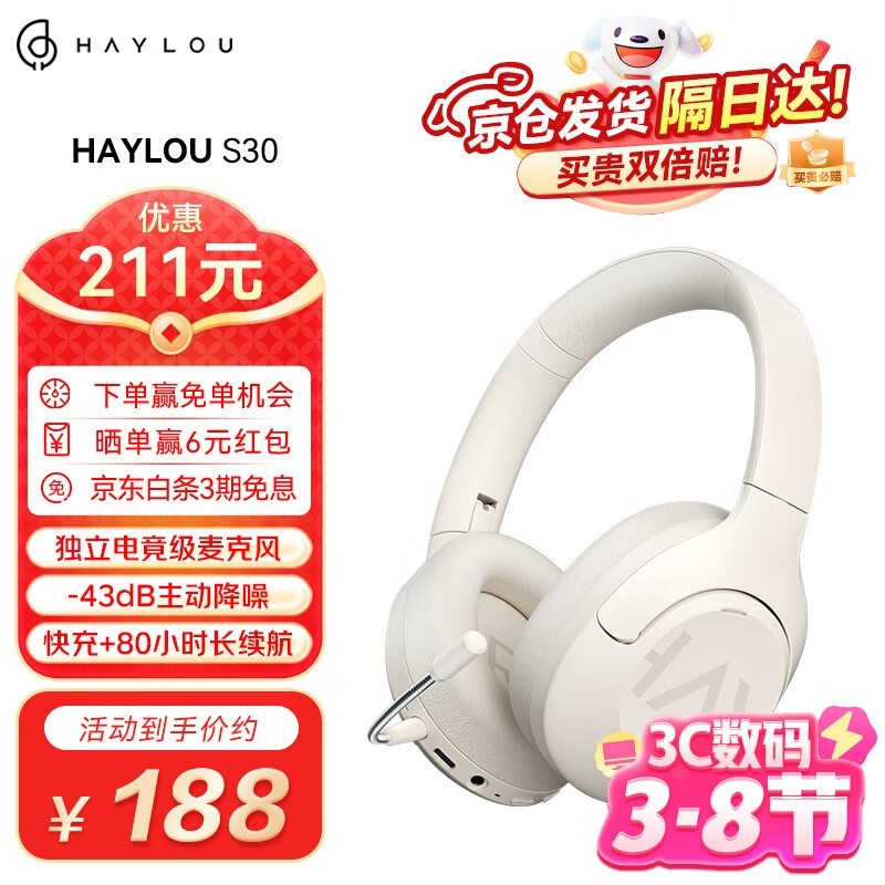 HAYLOU S30主动降噪头戴耳机金标音质80H长续航仅188元