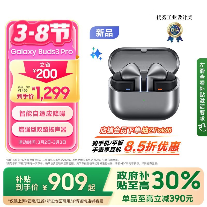 三星Galaxy Buds3 Pro真无线降噪耳机星际银流沙白刀锋LED设计