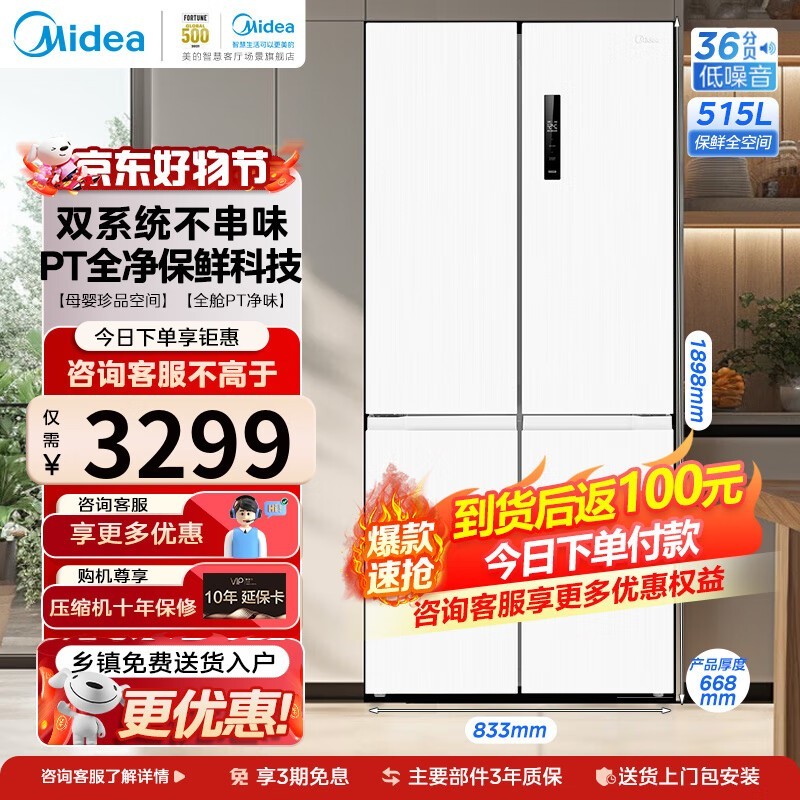 美的515L风冷十字对开门冰箱MR-540WSPZE大容量静音节能