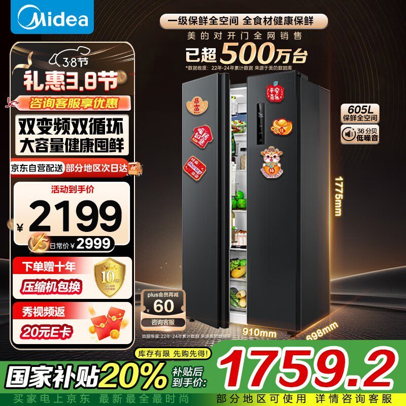 美的605升对开门冰箱风冷无霜双变频京东活动价1749元