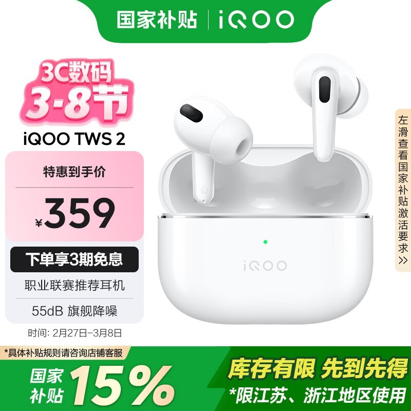 iQOO TWS 2真无线降噪耳机Hi-Fi级音质游戏低延迟电光白