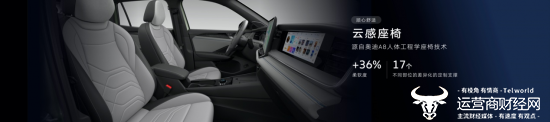 舒适体验上,全新探岳L 配备了专为中国用户研发的云感座椅,座椅柔软度提升了 36%,坐上去可以完全放松。除柔软外,云感座椅还拥有Audi A8 同款人体工学座椅设计,提供身体从靠背到大腿共 17 处不同部位的差异化定制支撑,即使长途驾驶也不感疲惫,让更多用户体验到越级的舒适。