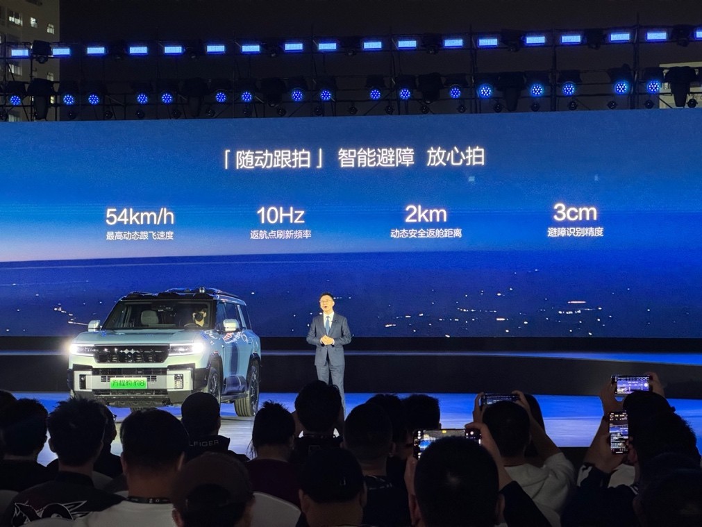 无人机支持自动起飞、25km/h下跟车返舱、自动充电、车顶和无人机双摄、一键成片等功能,大大降低无人机的使用门槛。