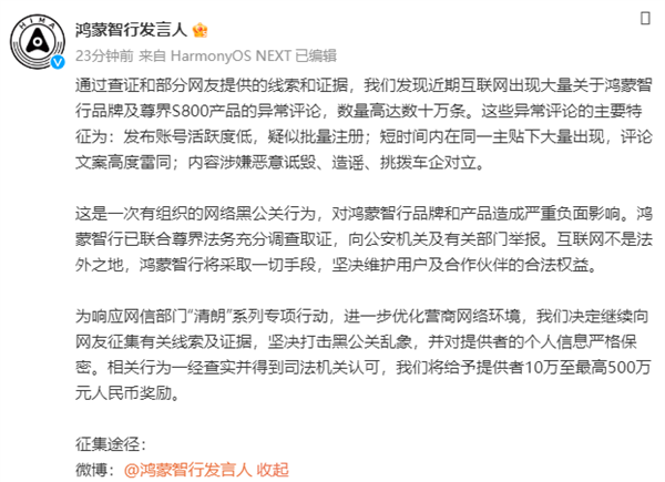 鸿蒙智行还将继续向网友征集有关线索及证据,坚决打击黑公关乱象,并对提供者的个人信息严格保密。相关行为一经查实并得到司法机关认可,将给予提供者10万至最高500万元人民币奖励。