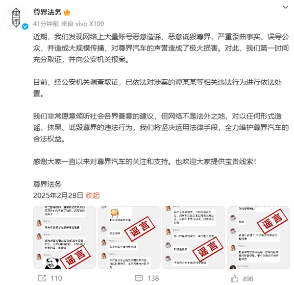 日前,“尊界汽车法务”官微也发文称,近期发现网络上大量账号恶意造谣、恶意诋毁尊界,严重歪曲事实、误导公众,并造成大规模传播,对尊界汽车的声誉造成了极大损害。